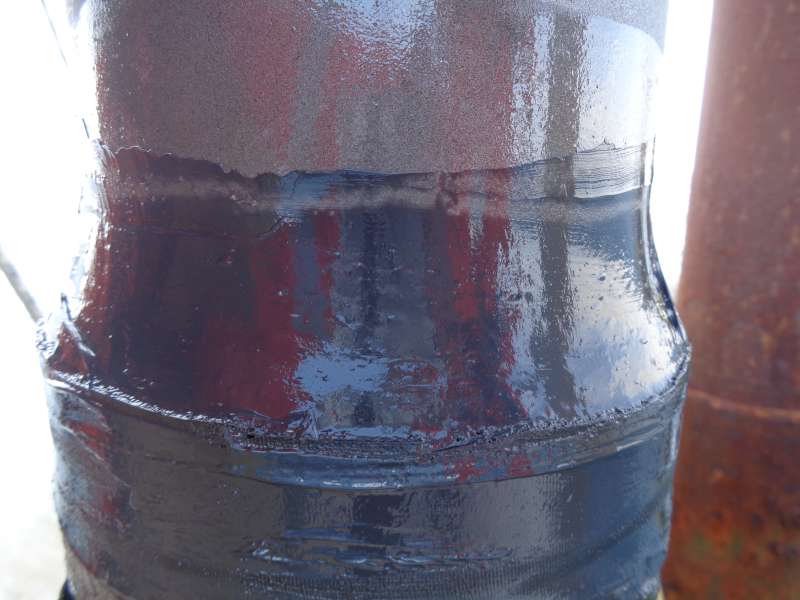 Na herstel van het staal is een nieuwe rubberen sleeve aangebracht om de riser opnieuw te beschermen tegen waterinfiltratie.